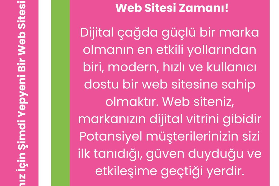 Dijital dünyada güçlü bir izlenim bırakmak, markanızı tanıtmak ve hedef kitlenize ulaşmak için profesyonel bir web sitesine sahip olmak artık bir zorunluluk haline geldi. Eğer web siteniz uzun süredir güncellenmediyse, mobil uyumlu değilse veya yavaş açılıyorsa, markanız için şimdi yeniden tasarlanmış bir web sitesi zamanı!